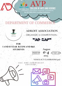 Department of Commerce Adroit Association has organized a competition “AD-ZAP” for I and II year B.Com and B.Com B&I students on 04.08.2023 at 10 am in the ICT classroom.Nine teams has participated in the competition.