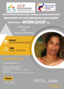Department of costume design and fashion in association with institution’s inovation council organizes a workshop on “Caricature and Tanjore Painting” on 22/12/2023 at 10.00 am.Totally 58 students were participated.