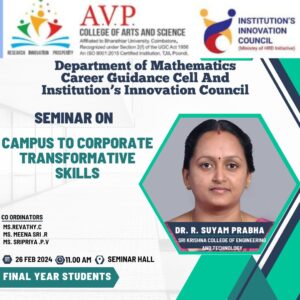 Cypher Association, Department of Mathematics in association with career guidance cell and Institution innovation council jointly organised a seminar on ‘ Campus to corporate transformative skills’ on 26.02. 2024. Resource person was Dr. Suyam praba, Associate professor MBA Sri Krishna college of engineering and technology Coimbatore.128 students got benefitted.