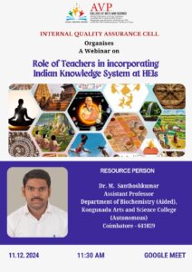 Internal Quality Assurance cell of AVPCAS has organised a webinar on “Role of Teachers in incorporating Indian Knowledge System in HEIs” on 11.12.2024( Wednesday )by 11.30 a.m.Dr. M. Santhosh Kumar, Assistant professor, Department of Biochemistry (Aided), Kongunadu Arts and Science College will be the Resource person for the event.