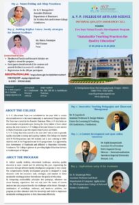 Internal Quality Assurance cell of our college has planned to organize a virtual Faculty Development program from 27.05.24 to 31.05.24 on topic ” Sustainable Teaching Practices for Quality Education”.