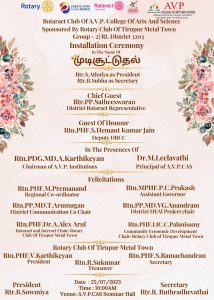 Rotaract Club of our college sponsored by Rotary Club of Tirupur Metal Town organised the Installation Ceremony on 25.07.2023 at 10am in seminar hall. Rtr.PP.Satheeswaran, DRR has been invited as a Chief Guest and Rtn.PHF.S. Hemanth Kumar Jain, Deputy DRCC as the Guest of Honour. President of Rotary Club of Tirupur Metal Town, Rtn. PHF.V.Karthikeyan collared Rotaract Club new president Rtr.S.Athulya of III Bsc Maths. Outgoing secretary Rtr.R.Ruthradhevathai,exchanged charter with upcoming secretary Rtr.B.Subha, III BBA. Around 80 Rotaract members have participated in this program.