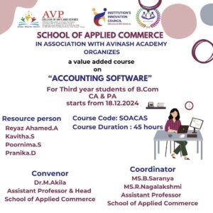 School of Applied Commerce in association with Avinash academy organized a value added course on ” Accounting Software” on 18.12.24.