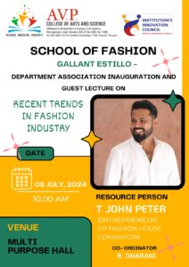 The School of Fashion, has organized the Department Association Inauguration of Gallant Estillo and Guest Lecture on 8th July 2024. As a special guest for the occasion Mr.T.JOHN PETER , Entrepreneur of J.P.Fashion house ,Coimbatore. Delivered a session on “RECENT TRENDS IN FASHION INDUSTRY “for the CDF students.He shared his knowledge and experience in the Fashion field. Totally 107 students participated the session.
