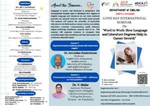 On 24.7.2025 , School of Liberal Arts-English, A. V. P College of Arts and Science in association with MoU partner KG College of Arts and Science organized a one day International Seminar on Word to work: How language literature degrees help in career growth. The resource persons Dr. Aravindhan Balakrishnan, Professor, English Unit, Preparatory studies Centre, University of Applied Science and Technology, Nizwa, Sultanate of Oman, Dr. V. Malar, Assistant Professor, Department of English, L. R. G. Government College for Women, Tirupur, shared their expertise on how language and literature is interlinked in developing the individual literarian and the plentiful career opportunities available for literature students. Both the sessions were eye opening and enriched the academic gathering.