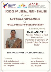 School of Liberal Arts – English has organised Life skill Programme on Build Habits for Success exclusively for English Department students on 14.08.2025. The resource person for the programme was Dr.G.Ananthi, Associate Professor & Head, Department of Commerce with CA, St.Joseph’s College for Women, Tirupur.
