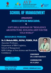 School of Management organized an Association Inaugural and Soft Skill Seminar on “Resilience Architecture: Building Grit for the VUCA World on 17.07.2025. Dr.S.Mekala , Associate professor, School of Management, KPR College of Arts Science and Research was the chief guest for the day.
