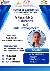 School of Mathematics-Cypher Association organized an Alumni talk on “Education and Skill Development” On 11.03.25 @1.30pm in ICT Classroom. Ms. D. Nikisha, Teacher, Kids Club School was the speaker.