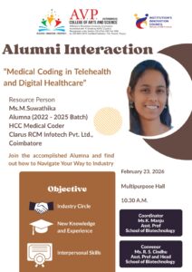 The School of Biotechnology organized an Alumni Interaction on “Medical Coding in Telehealth and Digital Healthcare” on 23/02/2026 at the Multipurpose Hall at 10.30 A.M. The resource person, Ms. M. Suwathika, Alumna and HCC Medical Coder at Clarus RCM Infotech Pvt. Ltd., shared valuable insights on medical coding, telehealth, and career opportunities in digital healthcare. The program benefited undergraduate and postgraduate students of Biotechnology and was highly informative and interactive.